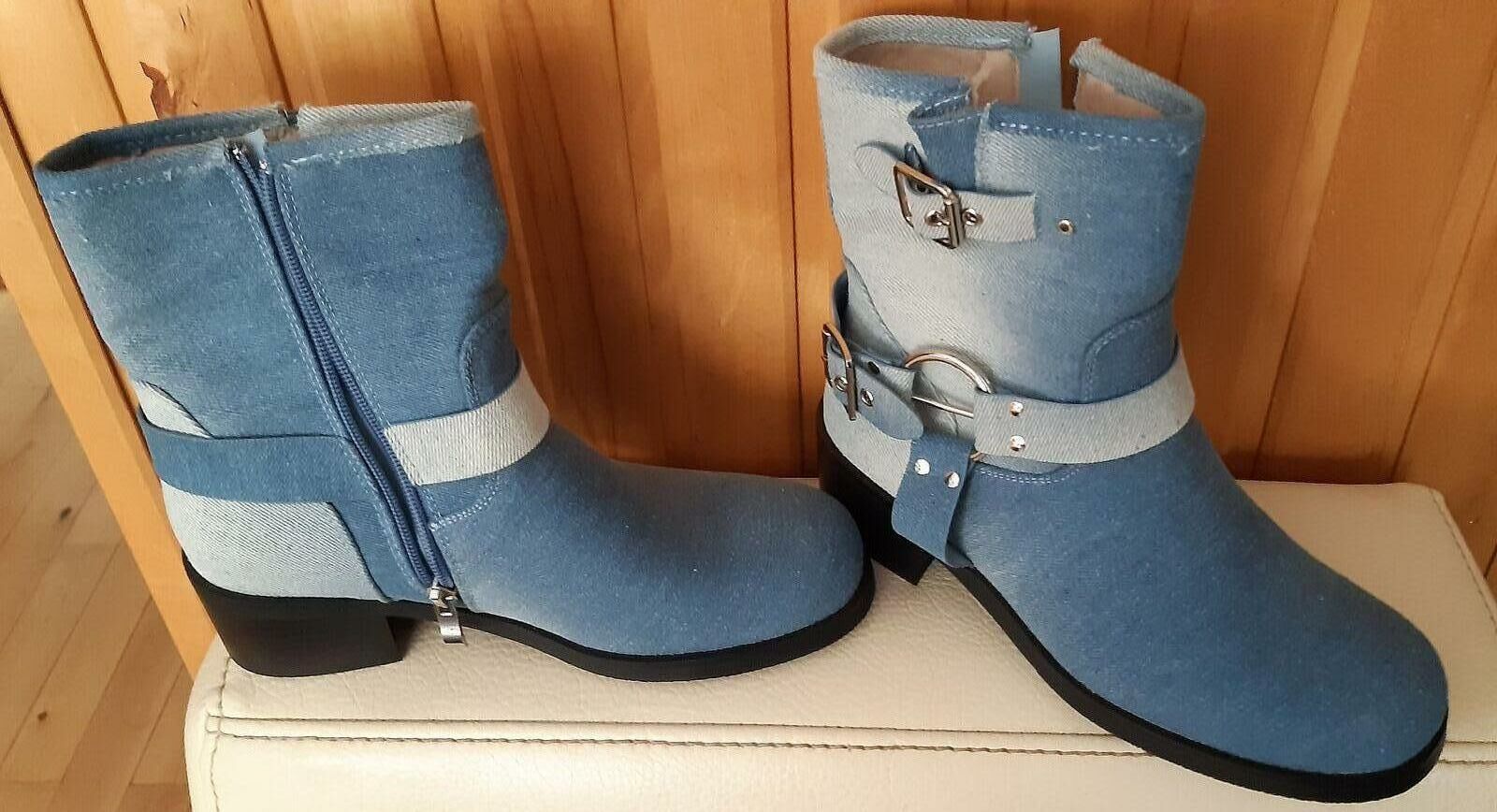 Nowe, bawełna tworzywo stylizowane na dżins. Wysokość szerokiego obcasa 5cm, całkowita wys.buta 20 cm razem z obcasem.