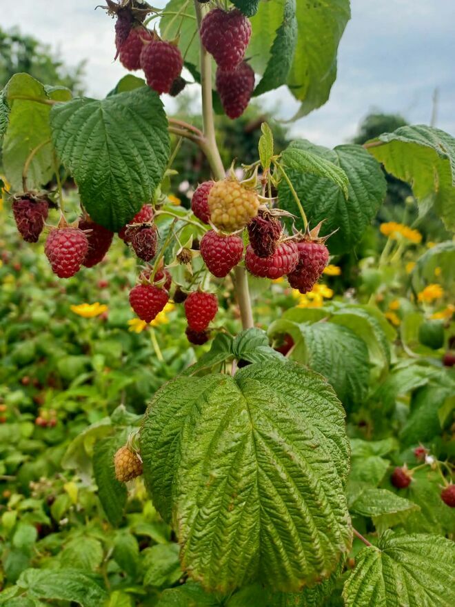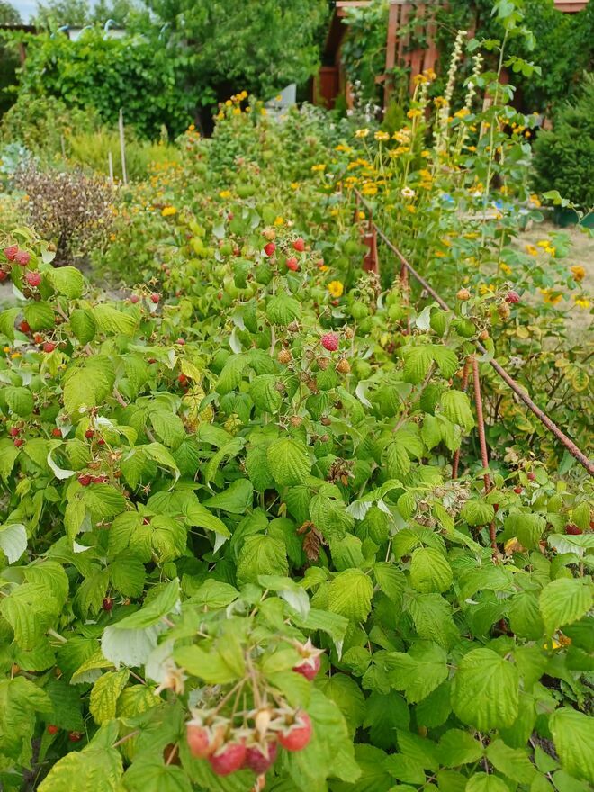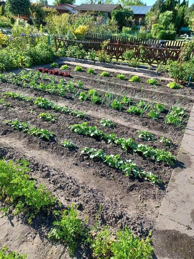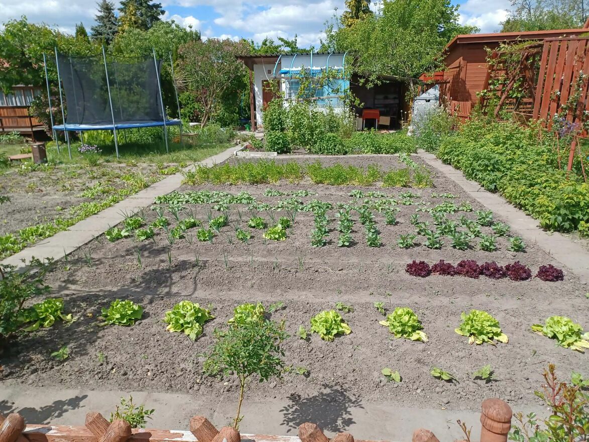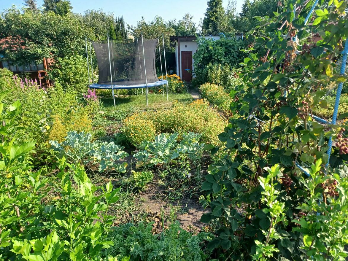 Drzewa owocowe, truskawki, maliny, porzeczki czarne i czerwone, winogrona, brzoskwinia kiwi oraz inne nasadzenia. Wydzielone 2 części uprawne oraz część rekreacyjna.