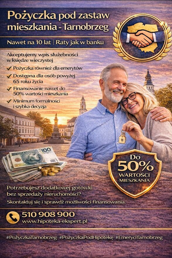 Potrzebujesz większej gotówki w Tarnobrzegu, ale bank odmówił kredytu? Jeśli posiadasz mieszkanie lub dom, możesz otrzymać pożyczkę pod zastaw mieszkania Tarnobrzeg z wygodnym okresem spłaty nawet do 10 lat. Dzięki zabezpieczeniu hipotecznemu możliwe jest uzyskanie finansowania również w sytuacji, gdy bank nie chce udzielić kredytu.Oferujemy pożyczkę pod zastaw nieruchomości Tarnobrzeg, która pozwala uzyskać środki bez sprzedaży mieszkania lub domu. To rozwiązanie dla osób potrzebujących większej gotówki na dowolny cel.