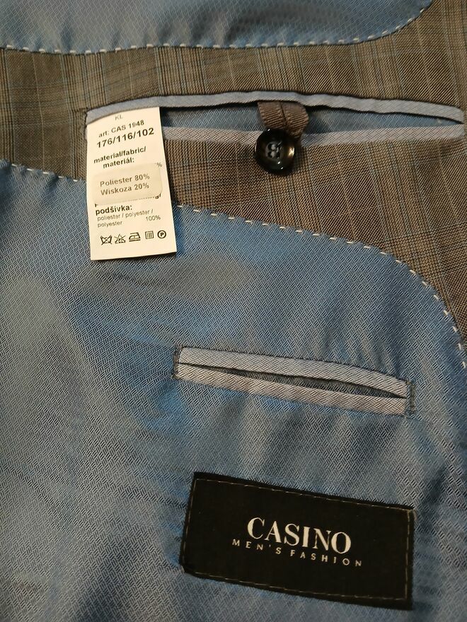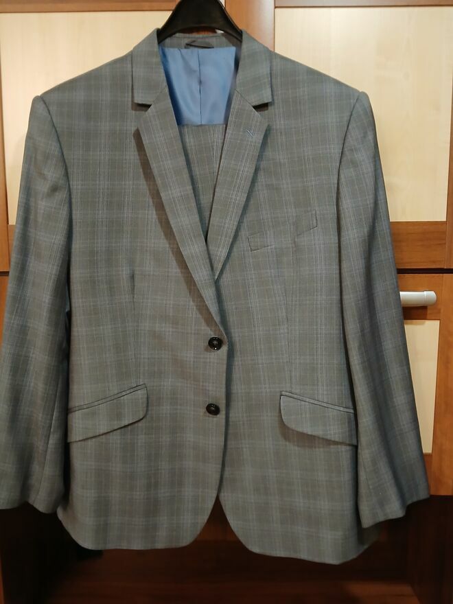 Garnitur w kratę. Szary. Rozmiar 176/116/102. Zakupiony wiosna 2025, użyty jeden raz. Stan bardzo dobry.Bogdan