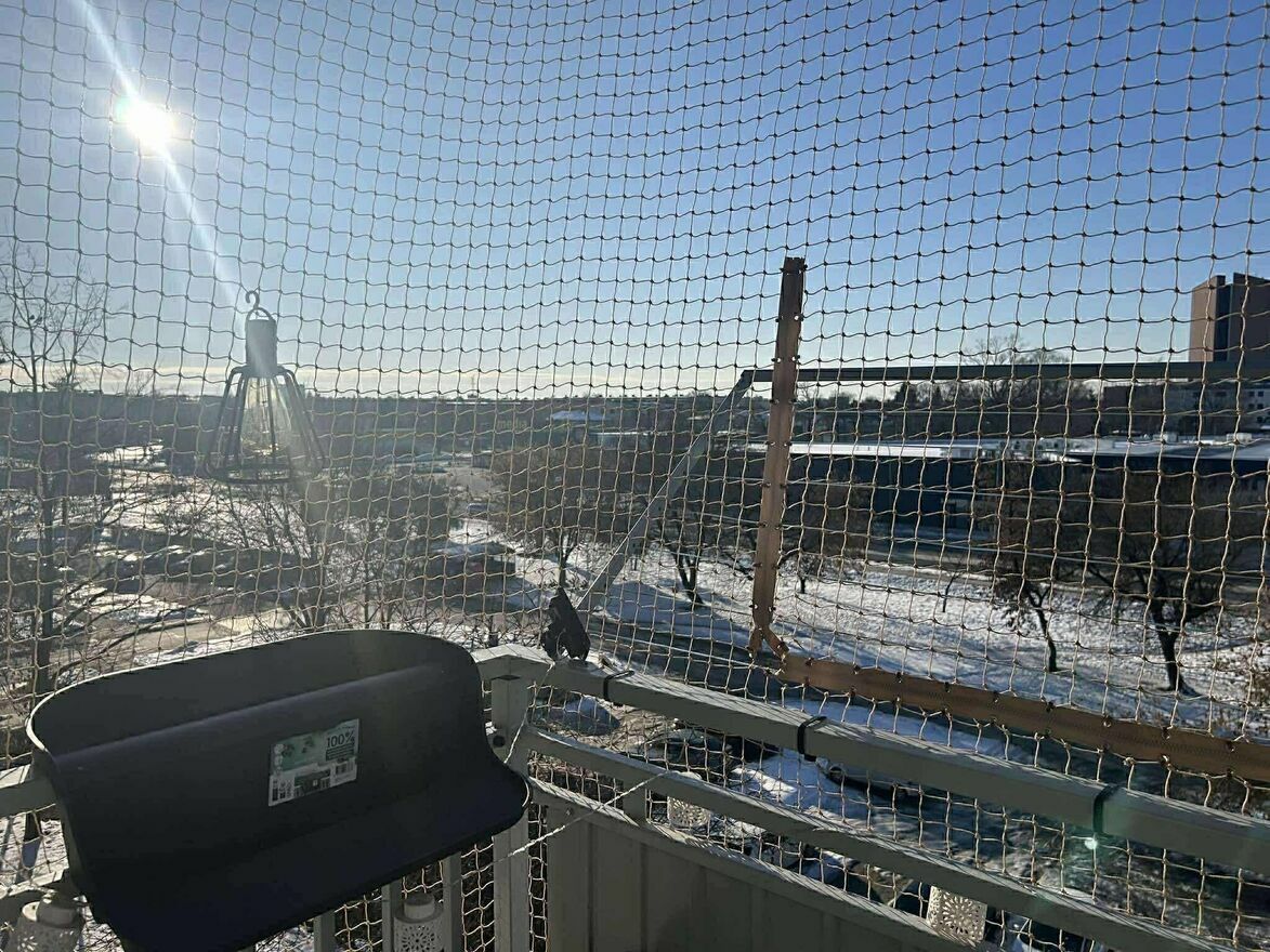 Mieszkanie po remoncie. Nowy, podwyższony balkon z daszkiem oraz zabezpieczającą siatką wykonaną przez specjalistów – bezpieczne rozwiązanie dla właścicieli zwierząt.