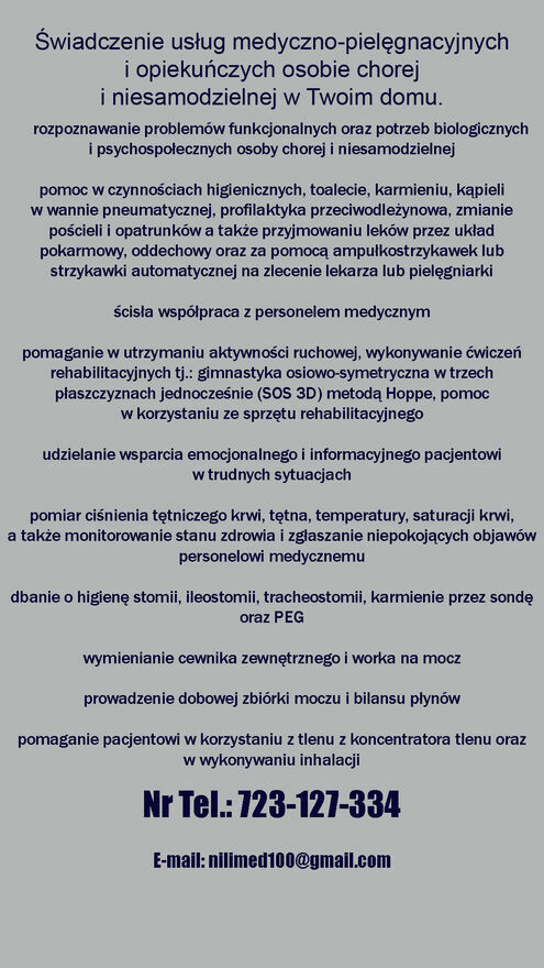 Dzień dobry oferuję mobilne usługi medyczno-pielęgnacyjno-opiekuńcze w domu chorego na terenie Tarnobrzega, Sandomierza , Mielca , Nowej Dęby i okolic . Serdecznie zapraszam do kontaktuSprawdź zainteresowanie tym ogłoszeniem